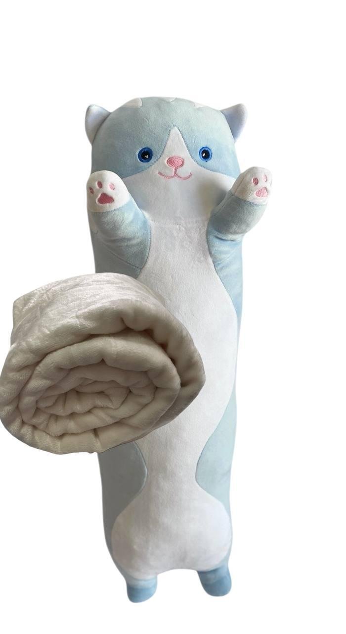 М’яка іграшка подушка обнімашка з пледом 3 в 1 котик Батон блакитний 95 см М123/3