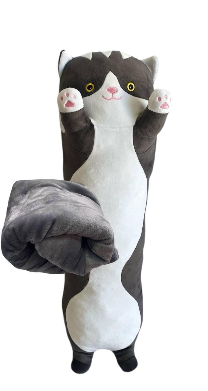 М’яка іграшка подушка обнімашка з пледом 3 в 1 котик Батон темно сірий 95 см М123/3