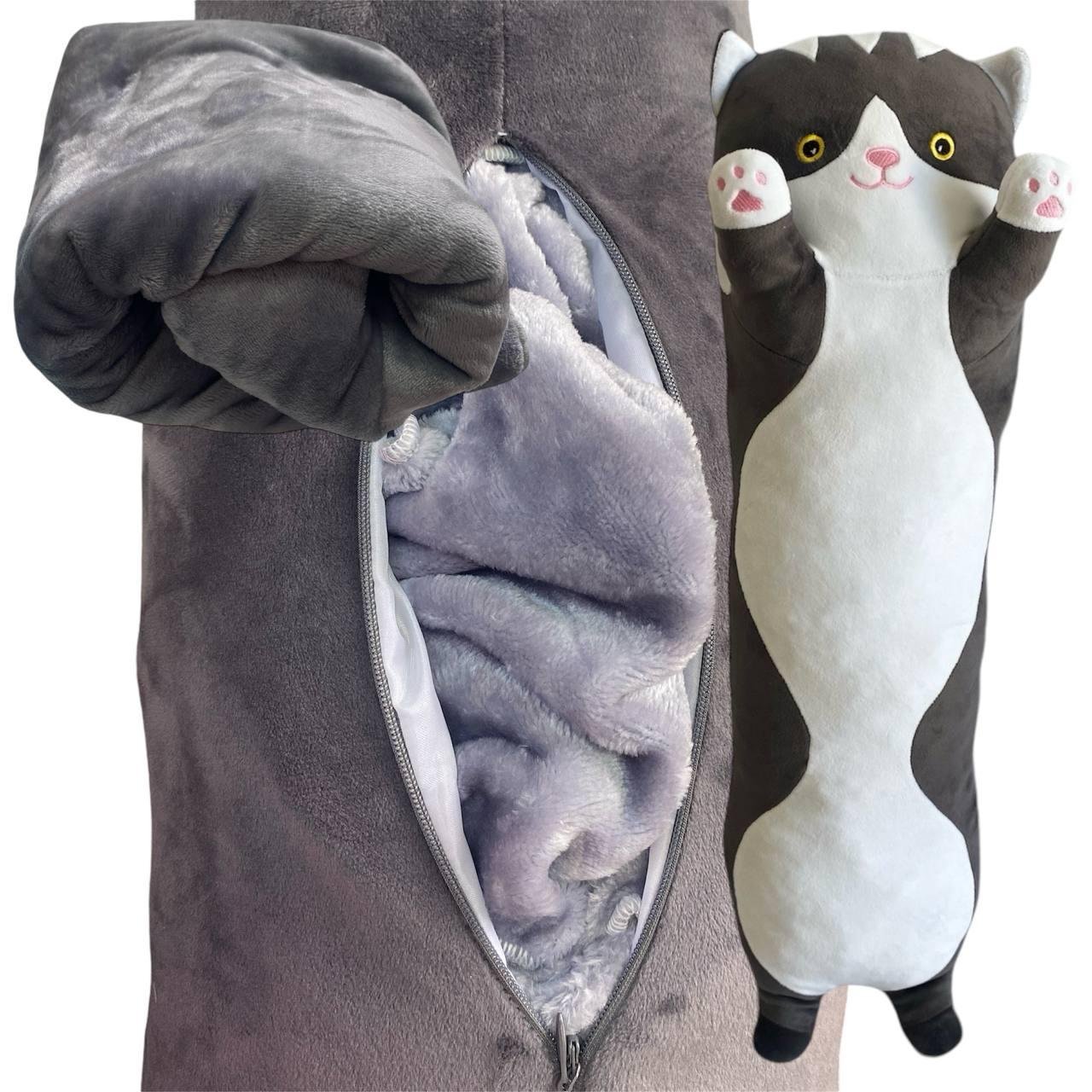 М'яка іграшка обнімашка створена, щоб дарувати найтепліші обійми, а плед, який ховається в середині, зігріє вас у холодний зимовий вечір, а також подарує неймовірний комфорт і спокійний сон. Вона стане відмінним доповненням для інтер'єру і додасть у ваш будинок атмосферу затишку, так само іграшку дуже зручно брати в поїздки завдяки компактному розміру. У зібраному стані іграшка представляє собою чарівного котика, в середині якого захований плед. Ззаду є замок-блискавка. Сама іграшка може служити в якості подушки, адже вона м'яка і приємна на дотик. Ця іграшка-подушка дуже сподобається малюкам. Виріб доможе розважити дітей в дорогзі і забеспечить веселе дозвілля вдома. Іграшка виготовлена з якісних матеріалів. Ідеальний подарок як для дітей, так і для дорослих. Незалежно від віку ця іграшка стане відмінним подарунком і подарує багато приємних емоцій. Розмір 95 см