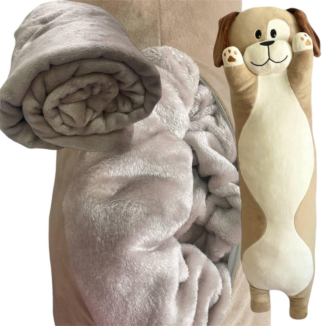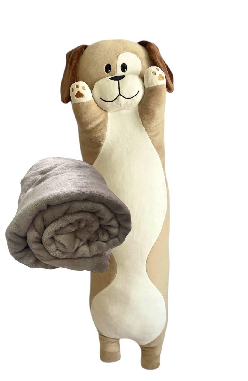 М'яка іграшка обнімашка створена, щоб дарувати найтепліші обійми, а плед, який ховається в середині, зігріє вас у холодний зимовий вечір, а також подарує неймовірний комфорт і спокійний сон. Вона стане відмінним доповненням для інтер'єру і додасть у ваш будинок атмосферу затишку, так само іграшку дуже зручно брати в поїздки завдяки компактному розміру. У зібраному стані іграшка представляє собою чарівну собачку, в середині якого захований плед. Ззаду є замок-блискавка. Сама іграшка може служити в якості подушки, адже вона м'яка і приємна на дотик. Ця іграшка-подушка дуже сподобається малюкам. Виріб  доможе розважити дітей в дорогзі і забеспечить веселе дозвілля вдома. Іграшка виготовлена з якісних матеріалів. Ідеальний подарок як для дітей, так і для дорослих. Незалежно від віку ця іграшка стане відмінним подарунком і подарує багато приємних емоцій. Розмір 75 см